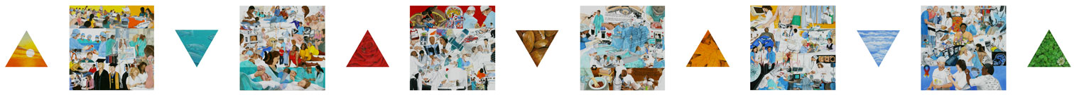 As with many of my large-scale public art commissions, I began this work by creating an interesting combination of geometric shapes that would give the work the expansiveness needed to convey the subject matter while maintaining the interest of the viewer. Within this series of shapes I applied images that would relate the story of the caring people and the dedicated work they do to bring excellent and compassionate care to their patients.