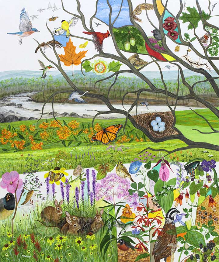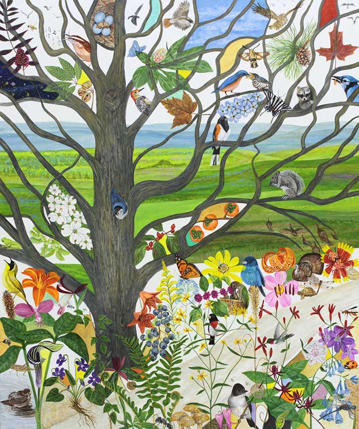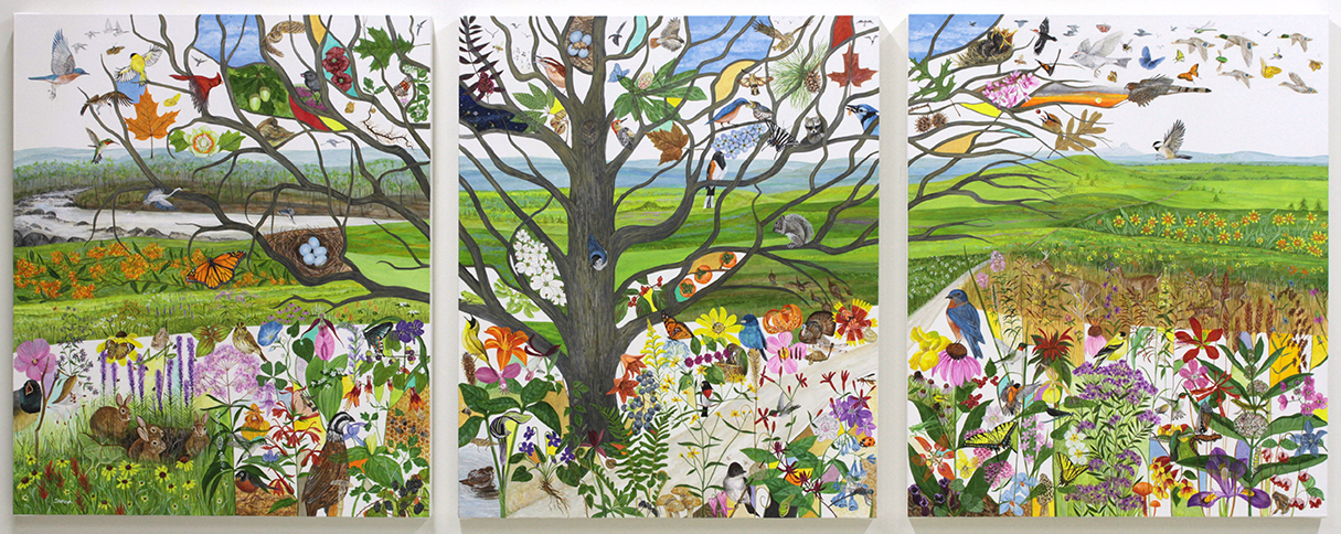 Three panels, with a central tree overlapping all panels. A path will begin under the tree and vanish into the distance hills. Middle horizontal section will be distant hills and valleys. Some of the hills will be detail close ups of flowers, grasses and insects. There is a river snaking around on the left panel. Between the limbs of the trees are details of birds, leaves, insects, sky, sunsets, leaves and other. The pattern of images between other images will repeat in the foreground. White will be the predominent impression. Details contrast with the white. Bluebirds are the main bird and focus is on them in a number of images from eggs, nest, flying and perching. The local Pilot Mountain landscape is a surprise in the horizon.
