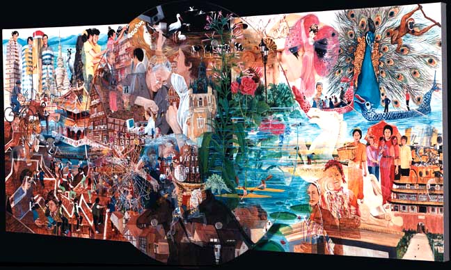 The painting "Bridge to Friendship" was created to celebrate the collaboration of German Machine Manufacturer and the Kunming Cigarette Factory in the Yunnan Province of China. Based around the unifying element of a blooming tobacco plant, the work brings together these seemingly diverse cultures through a collection of images which display the striking similarities the two cultures share.