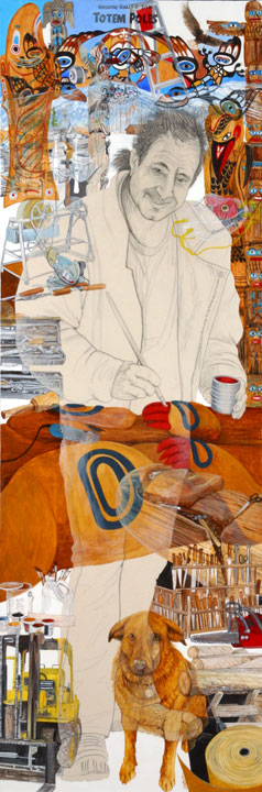 For example, in her portrait titled Art Collector, Ruth Julian, a longtime local art patron is framed all around by a richly hued montage of artworks in her collection and related objects that she displays in her home.
