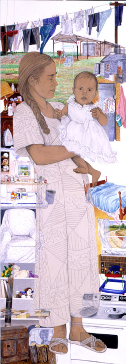 The work in which McNabb has achieved the most successful balance between the central portrait and the numerous, smaller, related scenes that surround it is Migrant Worker Family, Sarah and Gabrielle. Here a life-size drawing of a young woman wearing a long dress, sandals and pigtail braids tenderly holds a baby girl clad in a frilly dress, and they're surrounded by imagery from their daily domestic life, including a backyard landscape in which clothes are hung out to dry on a clothesline that cuts a strong diagonal across the top of the composition.
