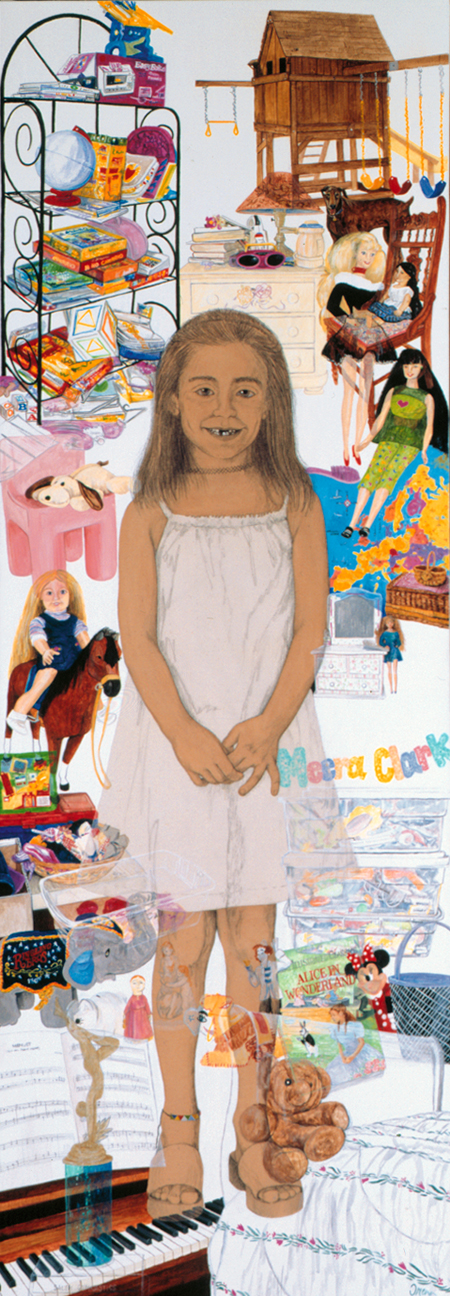 The color areas of my work have been described as a transparent, painted montage. Painted transparent scenes overlay each other to form a kaleidoscope of colors. These color areas depict the interests or life of the person in the portrait. These images can seem a bit surreal when many images overlap each other, but the meaning and depth of the painting deepens the longer one studies the piece. I am using the raw canvas to depict both the skin tone and the clothing of the individual. In some cases I am staining the canvas to indicate different skin tone.