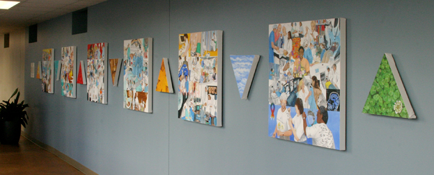 As with many of my large-scale public art commissions, I began this work by creating an interesting combination of geometric shapes that would give the work the expansiveness needed to convey the subject matter while maintaining the interest of the viewer. Within this series of shapes I applied images that would relate the story of the caring people and the dedicated work they do to bring excellent and compassionate care to their patients.