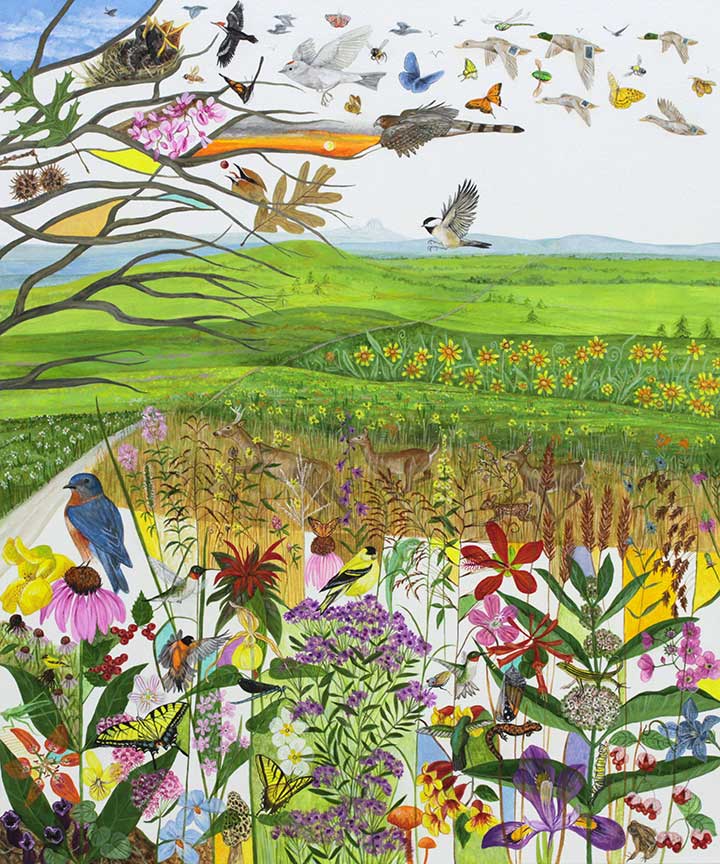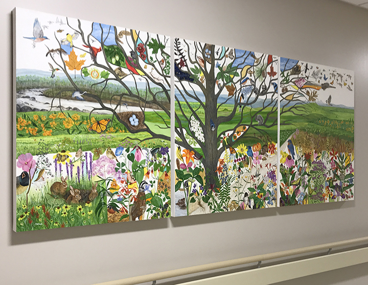 Three panels, with a central tree overlapping all panels. A path will begin under the tree and vanish into the distance hills. Middle horizontal section will be distant hills and valleys. Some of the hills will be detail close ups of flowers, grasses and insects. There is a river snaking around on the left panel. Between the limbs of the trees are details of birds, leaves, insects, sky, sunsets, leaves and other. The pattern of images between other images will repeat in the foreground. White will be the predominent impression. Details contrast with the white. Bluebirds are the main bird and focus is on them in a number of images from eggs, nest, flying and perching. The local Pilot Mountain landscape is a surprise in the horizon.