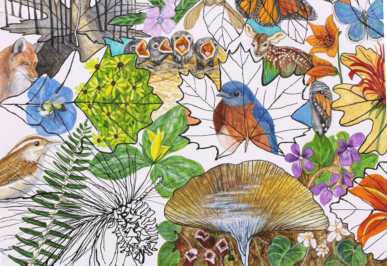 ![]() LEAVES & WILDLIFE Acrylic and Ink 24" x 36" Detail 1 - Detail 2 - Detail 3 - Detail 4 $2200 |