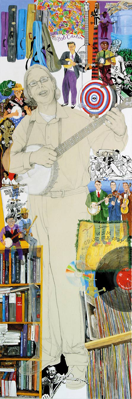 The color areas of my work have been described as a transparent, painted montage. Painted transparent scenes overlay each other to form a kaleidoscope of colors. These color areas depict the interests or life of the person in the portrait. These images can seem a bit surreal when many images overlap each other, but the meaning and depth of the painting deepens the longer one studies the piece. I am using the raw canvas to depict both the skin tone and the clothing of the individual. In some cases I am staining the canvas to indicate different skin tone.
