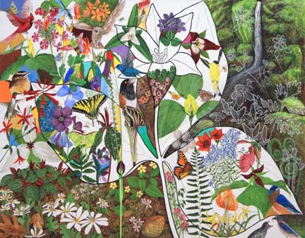 This curious and elegant synthesis of realism and imagination in Trena’s art reflects her interest in nature and the environment. Real world visuals come alive through her use of “windows” created by the overlapping images, adding a many layers to the story which becomes deeper the longer one studies the work.