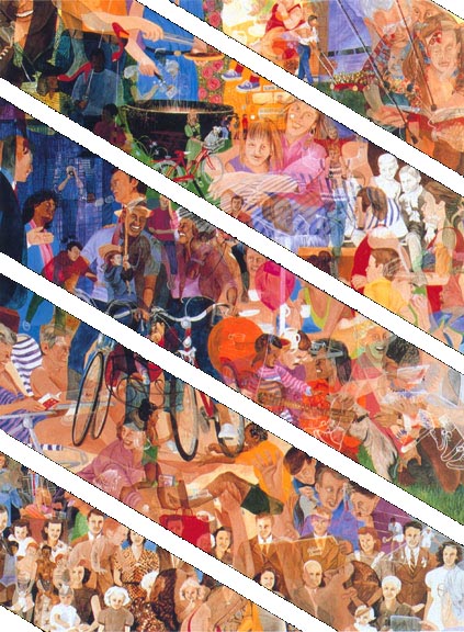 In this painting I tried to capture the feeling that we are all one family of credit union members. The images and scenes depict credit union members interacting with other family members. These family relationships span our families, jobs and leisure activities. That same sense of family extends to all members of the credit union as we share in its ownership.
